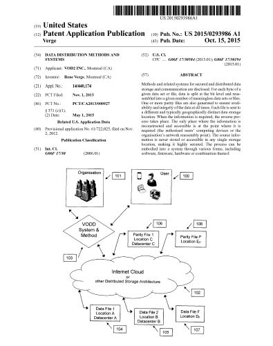 Abstract: Methods and related systems for secured and distributed data storage and communication are disclosed. For each byte of a given data set or file, data is split at the bit level and reassembled into a given number of meaningless data sets or files. One or more parity files are also generated to ensure availability and integrity of the data at all times. Each file is sent to a different and typically geographically distinct data storage location. When the information is required, the reverse process takes place. The only place where the information is reconstructed and accessible is at the point where it is required (the authorised users' computing devices or the organisation's network reassembly point). The source information is never stored or accessible in any single storage location, making it highly secured. The process can be embodied into a system through various forms, including software, firmware, hardware or combination thereof.
